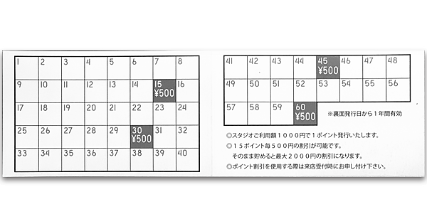 会員カードの中はスタンプカードになっております。 スタジオ料金1000円につき1ポイント付きます。 15ポイントで500円の割引が出来ます。 他店より貯まりやすいポイントカードになっておりますのでかなりお得です! カード有効期限ですが現在期限無しにしておりますので、そのままご利用出来ます。